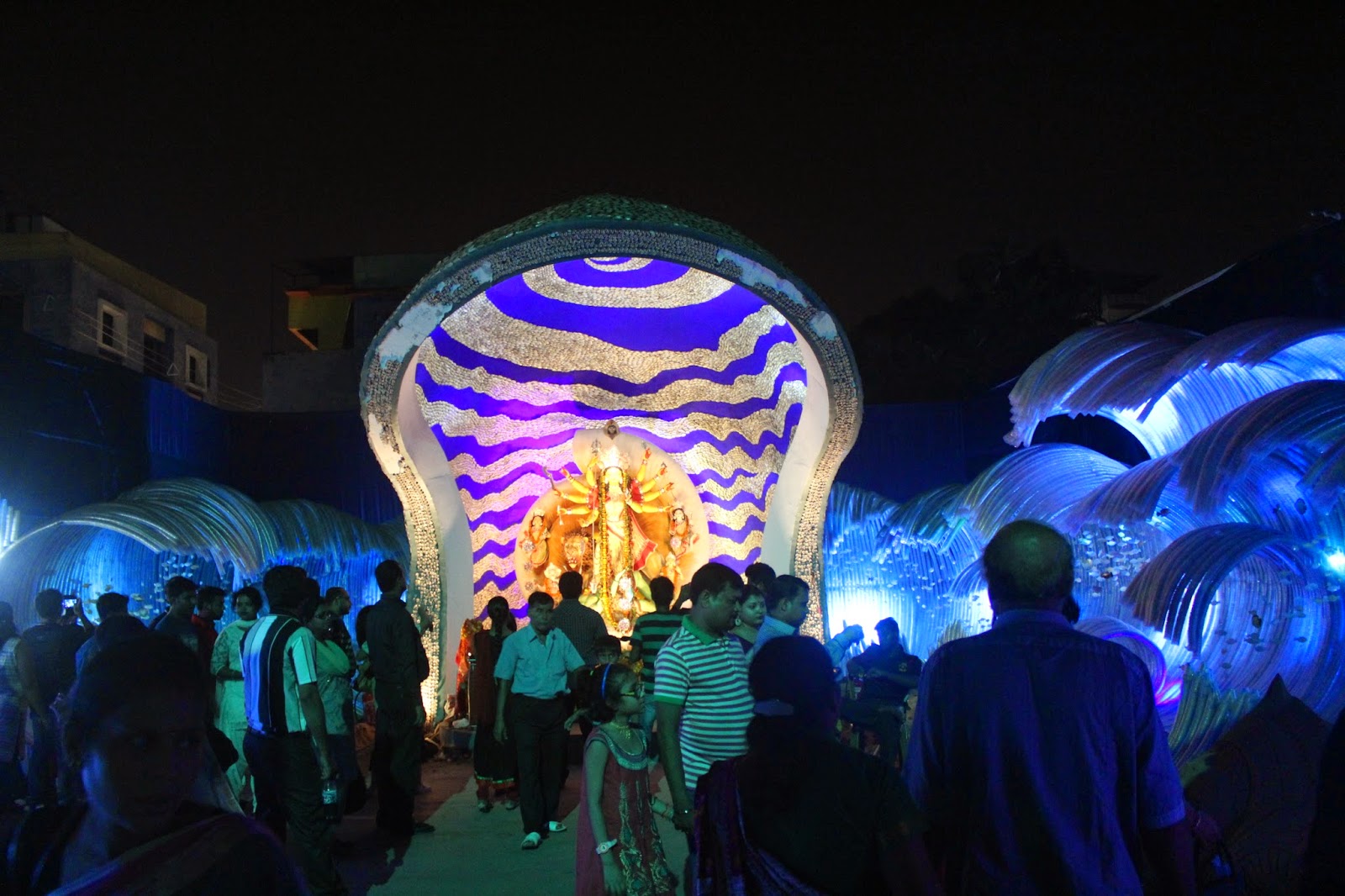Then we saw one pujo pandal themed as a tribute to the yesteryear  actress, Suchitra Sen. The walls adorned posters of her famous movies, dialogues and her pictures. Another pandal was a creative description of death, with red and white all over the place along with disfigured dolls of the gods hanging all around, the pandal was kind of creepy. Yet another had a Chinese inspired decor, even the idol had a lot more hands than the regular ten - probably even she couldn't rely on the Chinese hands/goods and wanted some backup!